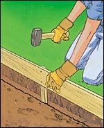 A cheaper alternative to Everedge is using wooden edging boards which are secured into the ground using wooden pegs driven into the ground and screwed together. Wooden edging is better suited to straight edges due to its nature but can be used for gentle curves by making a series of small cuts into the one side of the board. As it will eventually rot this type of edging will need to be replaced every 5 – 10 years depending on treatments and ground conditions.
